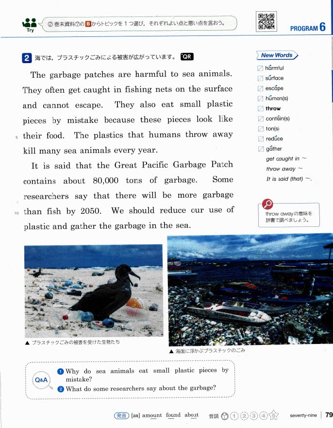 また、廊下に見学に来た小学生の作文が貼ってあったのに気付かれた方も多いと思います。子供の頃から地球環境に問題意識を持ってもらおうという学校の姿勢だと思われます。今日は諫早、大村、雲仙市で使われている中学3年生の英語の教科書をコピーしてきました。今学校ではちょうどこのページを勉強しているそうです。皆様と一緒に環境学習をしていきたいと思います。