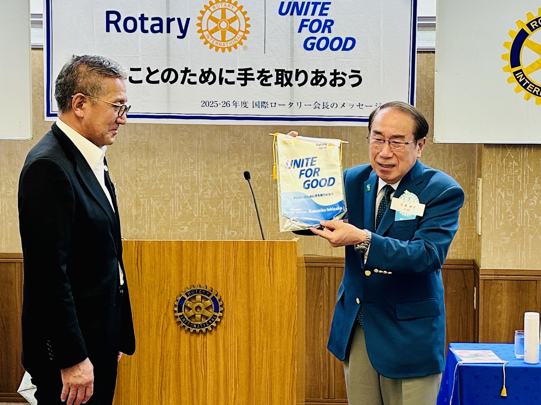 本日は2740地区石坂和彦ガバナー、中島幸利地区幹事、第8グループ山田和弘ガバナー補佐、他多くの地区役員、ご来訪者をお迎えしての公式訪問例会です。諫早クラブでは怒涛の7月、クラブフォーラムマンスとなりましたが、後ほど石坂ガバナーよりRI、あるいは地区運営について、ご講話とご指導を頂戴したいと思います。