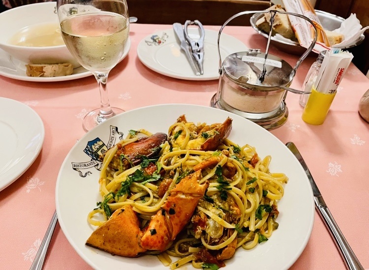もう一つ忘れられないのは、クラブいりスパゲティーです。見たところ日本のスパゲティーと同じです。それにクラブが1ぱいごろっと入っていました。半分身がむいてあって、そのかにから出た汁と麺を一緒にいただくと、もう思い出しただけで生つばが出ます。白ワインをお代わりしました。