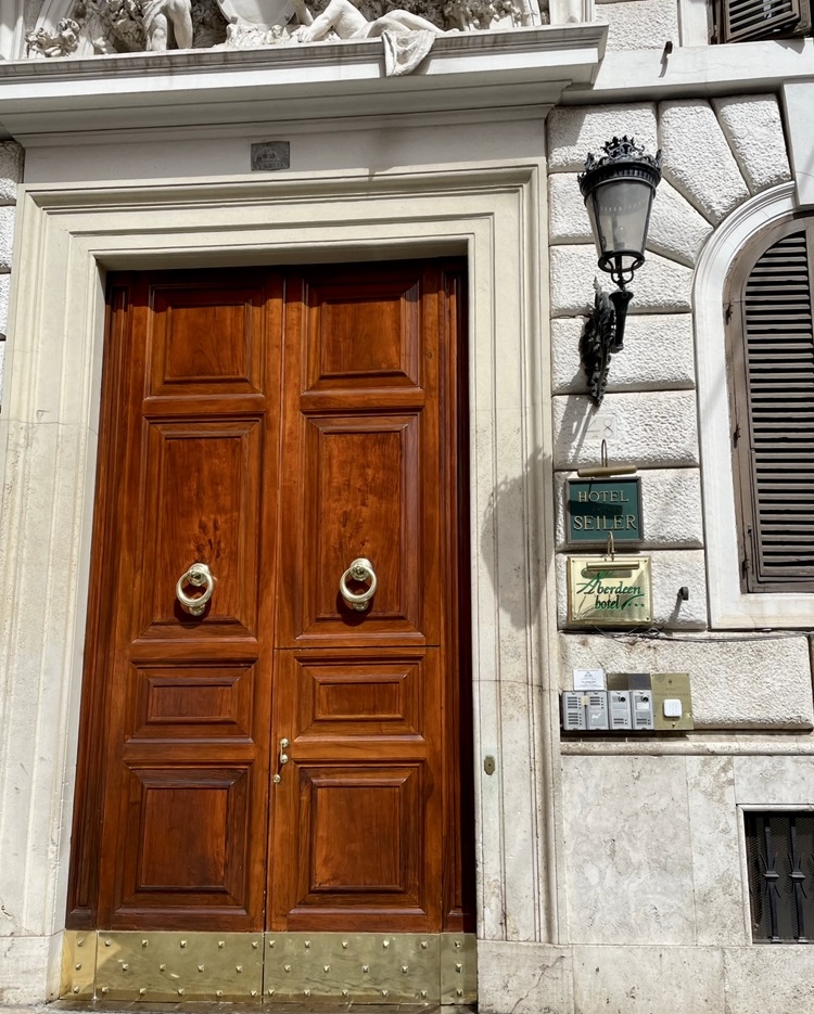 さて今日は、前々回の続きでイタリア旅行の話をさせていただきたいと思います。ローマに着いて、まずホテルをさがしたのですが、地図にある場所にホテルが見当たりません。40分ぐらいさがしても見つからず、途方にくれました。夜8時過ぎです。近くを通った人に聞いてやっとわかりました。なんとそのホテルは目の前にあったのです。わからないわけです。古いビルを借りて、ホテルと称して部屋を貸しているA&Bです。大きな扉のわきに別のホテル名が書いてありました。その下に小さくさがしていたホテル名が書いてありました。これじゃあ、わかるわけありません。